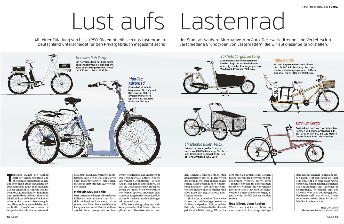 Illustration und Layout für auto motor und sport Heft 3/2018 Thema Lastenrad