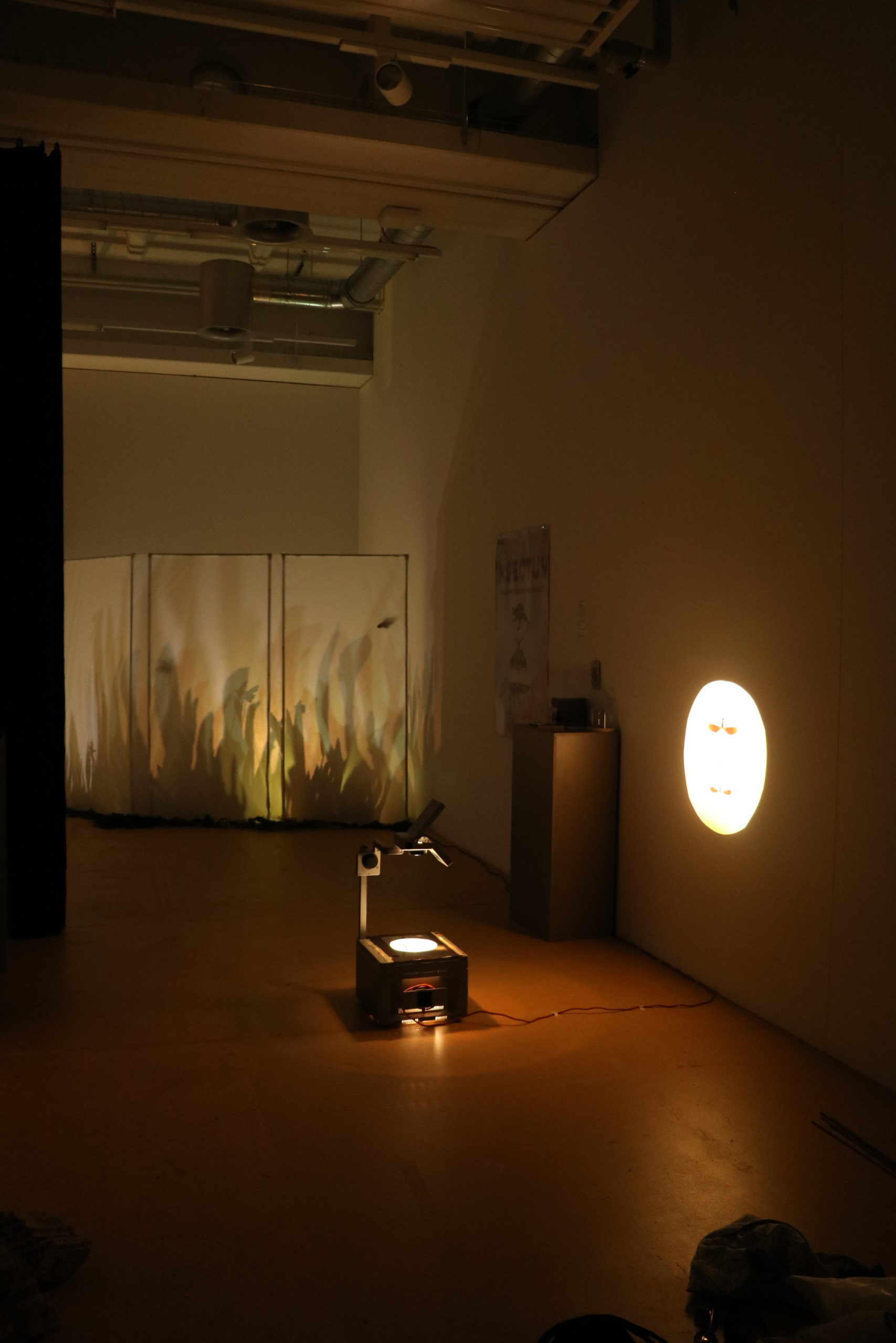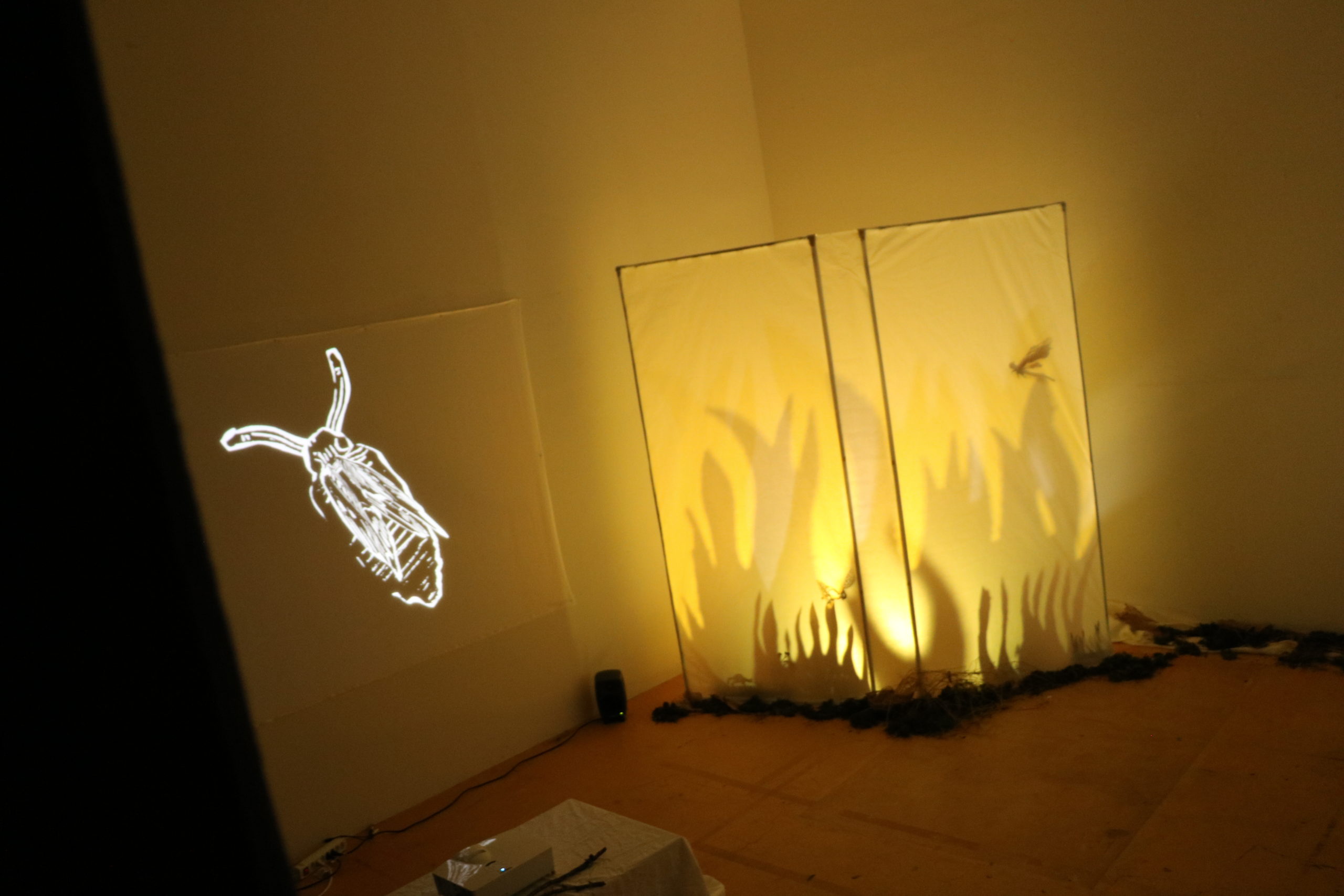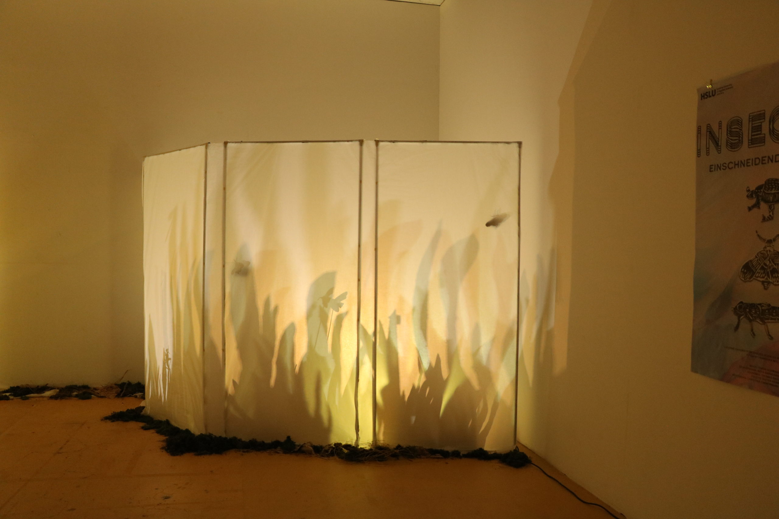 Ausstellung von Master Arbeit "Insectum - einschneidende Ereignisse" - zum Thema Insektensterben habe ich drei kurze Animationsfilme gestaltet und diese in einer Installation präsentiert. Diese beinhaltet 5 Stellwände und Scherenschnitte die in einer Größe gefertigt wurden, so dass der/die Betrachter:in sich in einer übergroßen Wiese wiederfindet. Die Installation soll zum einen die kleine Welt der Insekten für uns Menschen greifbarer und größer machen und zum Anderen auf die Zerbrechlichkeit und die Sensibilität der Tiere aufmerksam machen. Dar Trailer zum Film: Unter moving image oder https://vimeo.com/manage/videos/670578394